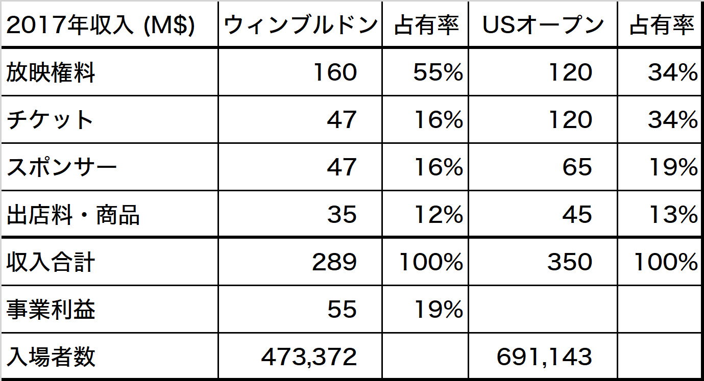 ウィンブルドンは毎年大きな黒字を計上する優良事業体である。経済誌フォーブスの記事(2018/6/27)にウィンブルドンとUSオープンの収入源比較が出ていた。わずか2週間のイベントで300億円を超える収入にも驚くが、収入源が大きく異なっているのが興味深い。