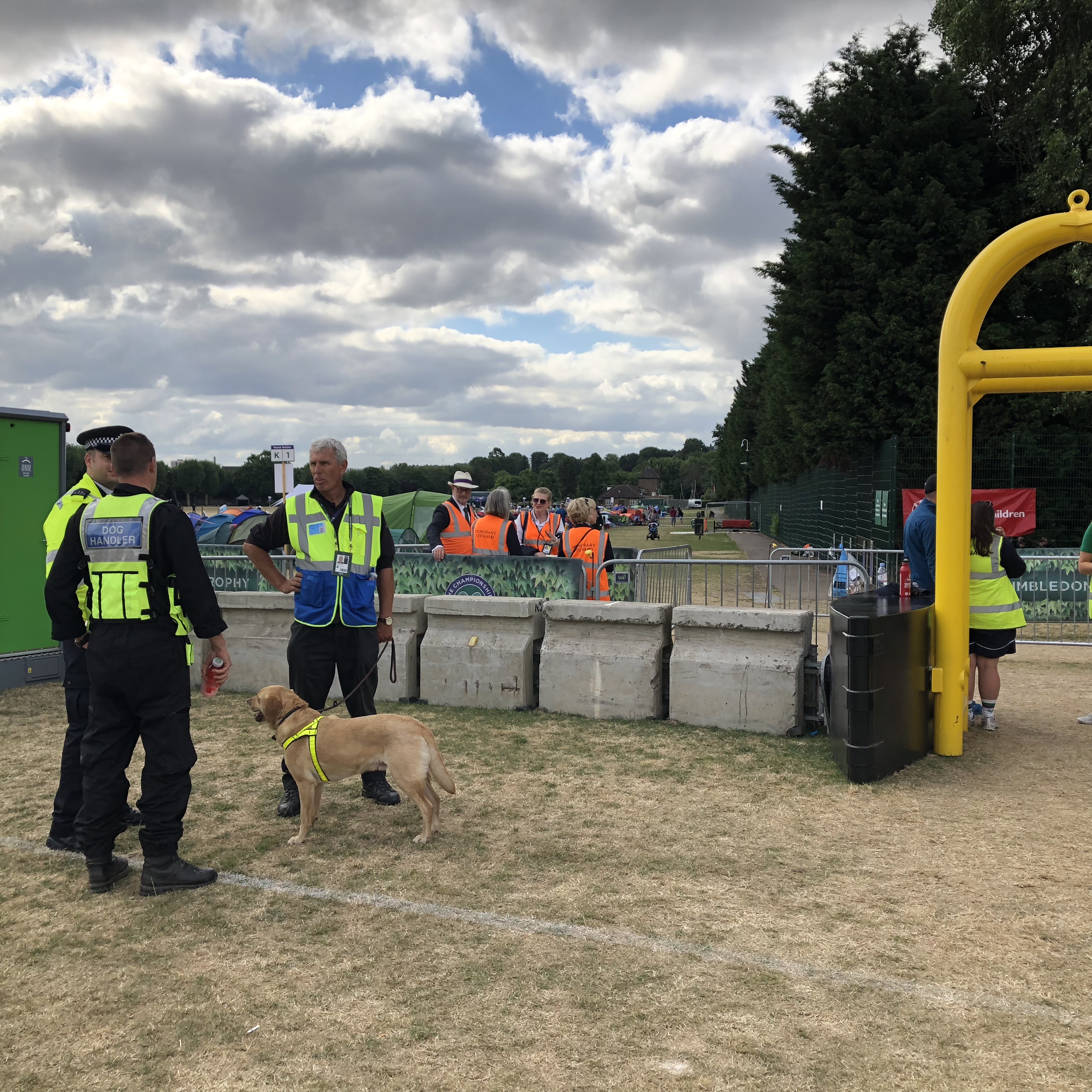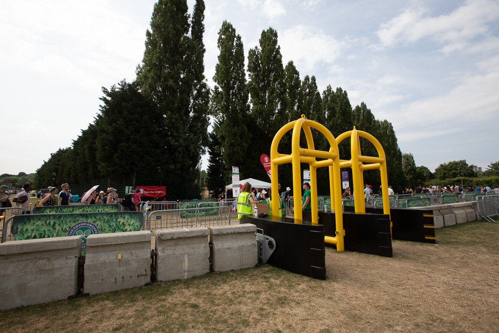 では、1日1万人近くの人が来る行列はどうか。行列の最大の弱点は暴走車によるテロだ。ウィンブルドンパークは駐車場としても利用されるが、駐車場エリアの周りには大型のコンクリートブロックで囲われ、それぞれのブロックが太い鉄製の連結棒で繋がれている。これでは装甲車でもない限り突破はできない。もうひとつのリスクは爆弾によるテロだが、これに対しては3頭の爆発物探知犬が活躍している。テント周りは深夜でも警備員が見回りをしており、昼間は警官が周回している。われわれは厳重に守られている。不安を感じることは何ひとつなかった。