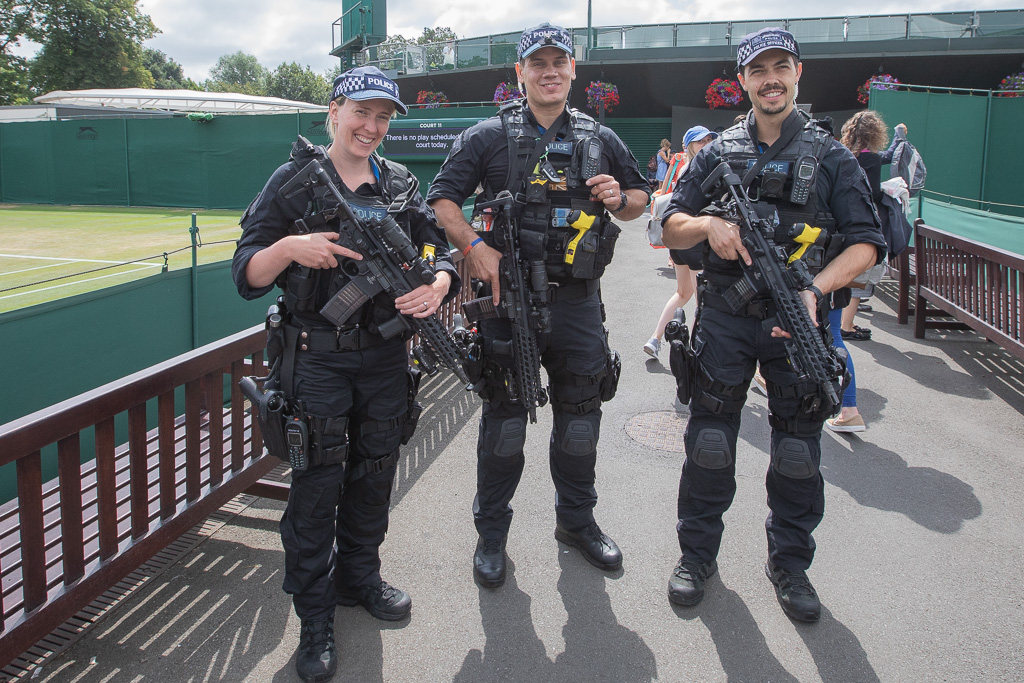 2017年のウィンブルドン直前の6月にロンドンブリッジで暴走車によるテロがあった。その犯人の一人が、ウィンブルドンの警備を担当する会社に求職していた。幸い雇用されることはなかったが、ウィンブルドンがテロリストのターゲットになる可能性があることはこれで明白になった。会場入り口では空港ゲートと同じように探知機をくぐり、荷物を徹底的に調べられる。2017年の新聞には、アンディ・マリーの荷物も徹底的に調べられる写真が出ていた。会場に入ると、自動小銃など重装備の警官たちが巡回している。